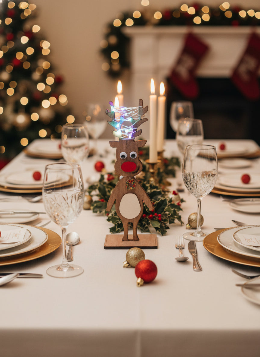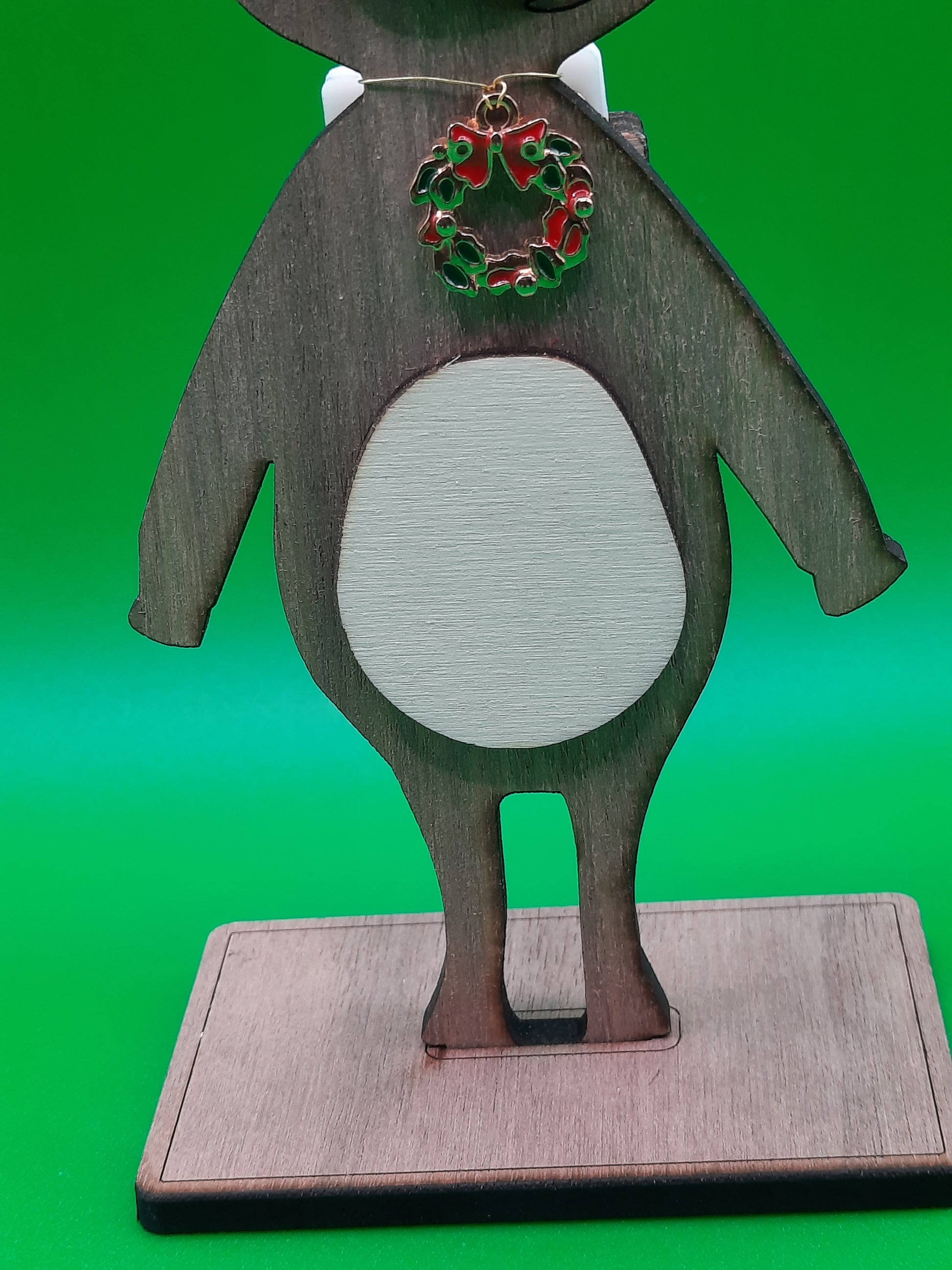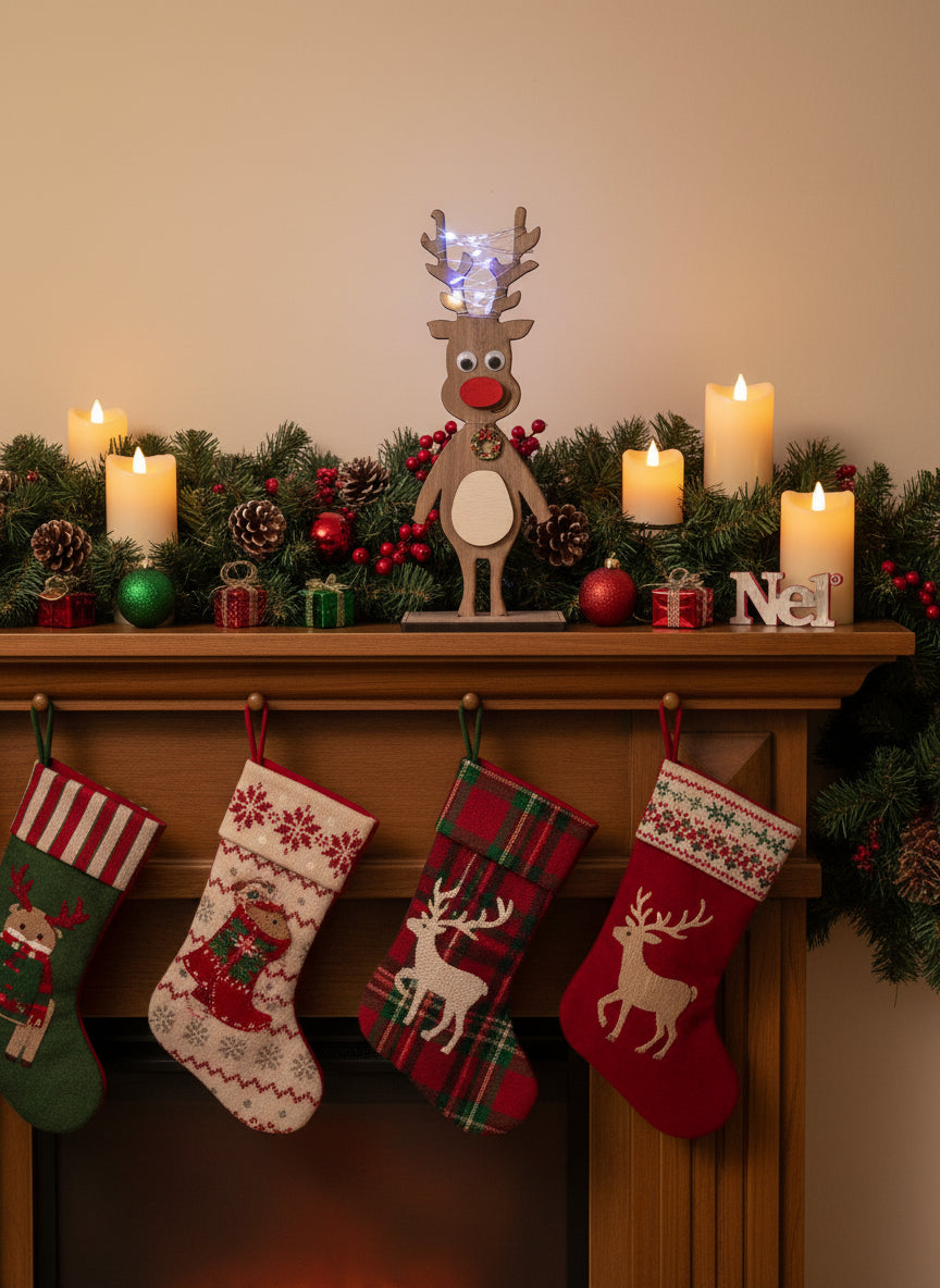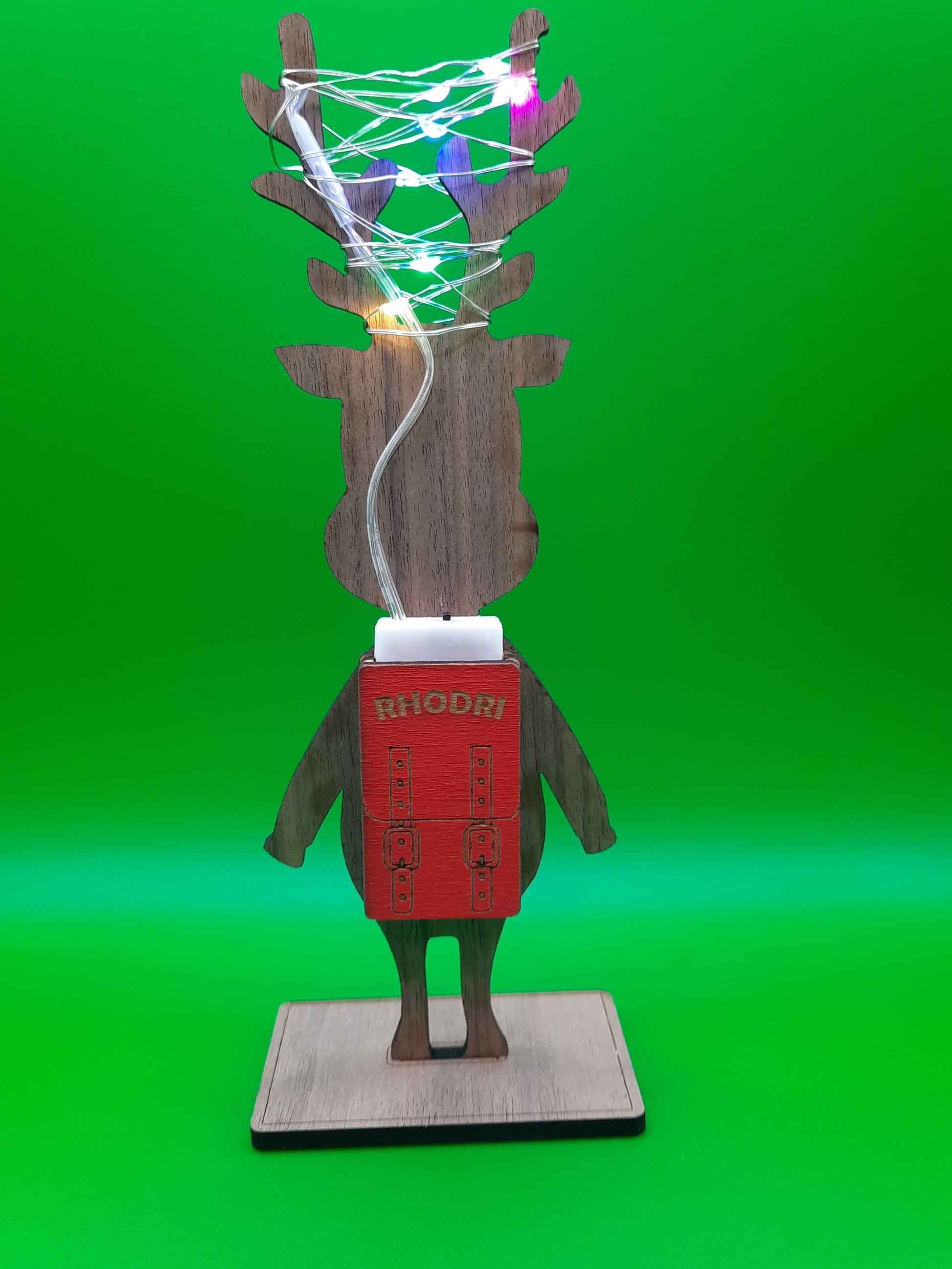 Rhodri's a cheerful little reindeer from the deep forests of Wales, in his Christmas outfit of smart neckwear (his neckoration) and colourful Christmas lights. He stands around 200mm (8") tall and is looking for a cosy mantelpiece or shelf to inhabit. His body is made from FSC-certified and upcycled materials, made and assembled in Wales and England. Neckoration and lights are made in China. Rhodri chooses his neckoration at the moment we dispatch him, and sadly we have no influence over his choices. Available in Red (standard), Blue, Green, and Yellow colour variants for his nose and backpack.